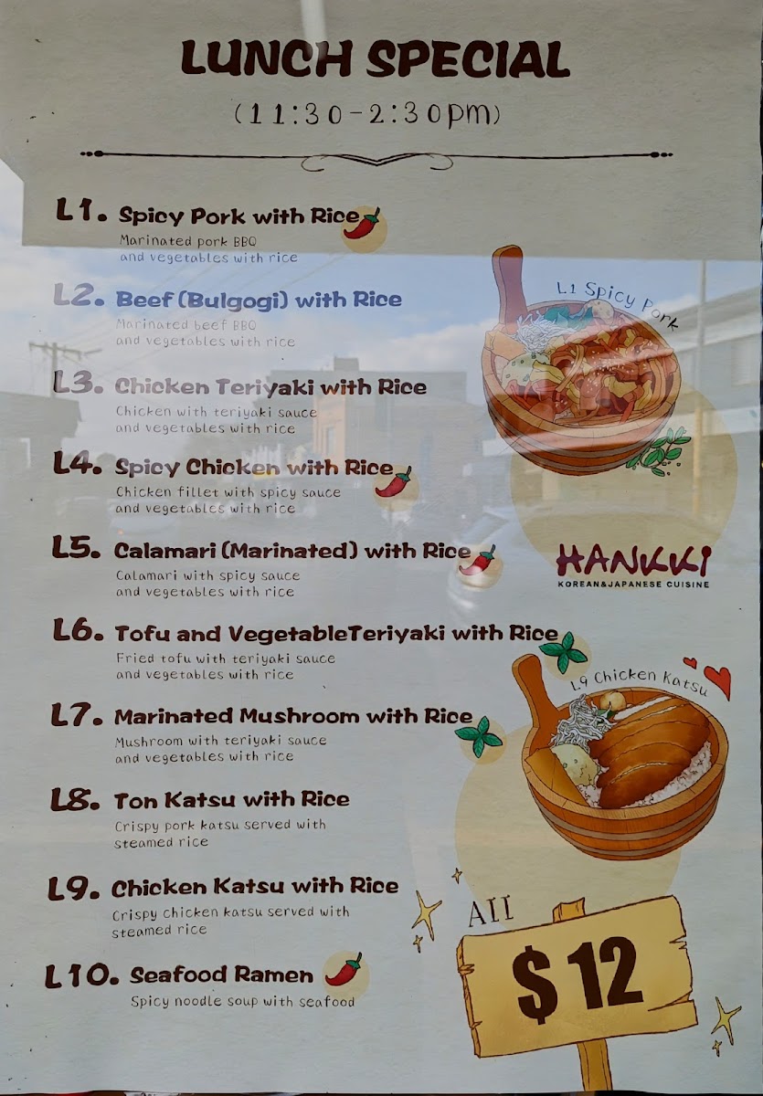 Hankki offers a well-rounded Korean menu that balances comforting traditional dishes with lively flavors. The selection is inviting for casual lunches, relaxed dinners, or sharing a meal with friends. You’ll find hearty rice bowls like Bibimbap and Bulgogi alongside popular plates such as Korean Fried Chicken and Spicy Pork Bulgogi, ideal for those craving a satisfying, home-style taste.